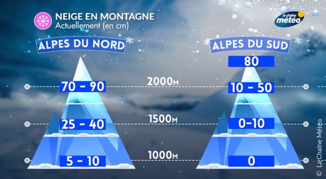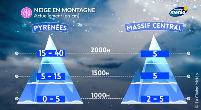 Dans ce contexte météorologique, les perturbations neigeuses sont passées sur le nord-est de la France : le Massif-Central et les Pyrénées restant sous l'influence de l'anticyclone, le temps est resté sec, souvent froid et venté avant un redoux ce week-end. Ces deux massifs n'enregistrent que quelques centimètres de saupoudrage, mais le froid a permis la production de "neige de culture" (canons à neige). Les Alpes du sud sont également démunies car les perturbations sont restées bloquées au niveau de l'Isère : cependant, il reste de la neige tombée en décembre.