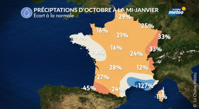 La première quinzaine de janvier a été particulièrement sèche en raison d'un blocage anticyclonique durable qui n'a pas permis aux perturbations océaniques de circuler sur le pays. La situation météo devrait progressivement changer ces prochains jours avec le retrait de l'anticyclone sur l'Atlantique et le retour des perturbations océaniques qui circuleront dans un flux de nord-ouest. On devrait donc retrouver des passages pluvieux en plaine et de la neige en montagne. Bonne nouvelle pour les Pyrénées et le Massif-Central qui manquent cruellement de neige.