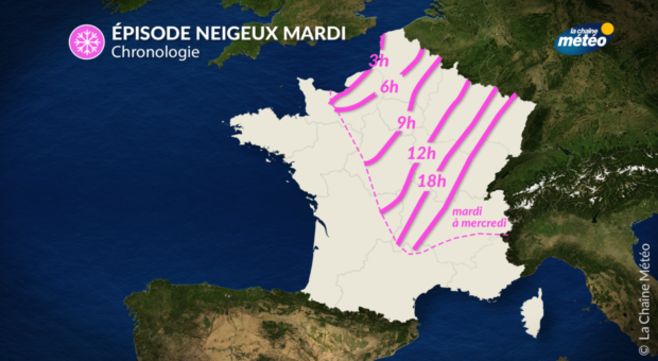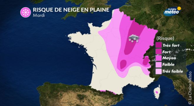 Une perturbation traverse une grande partie de la France du nord au sud mardi et mercredi. Comme elle se heurte à de l'air froid, elle provoque des chutes de neige sur de nombreuses régions de plaine mardi.