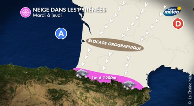 Sur les Pyrénées, de très abondantes chutes de neige sont prévues de mardi soir à jeudi : la couche pourrait atteindre un mètre à partir de 1200 mètres, mettant fin à la sécheresse en cours, à la plus grande joie des stations et des skieurs !