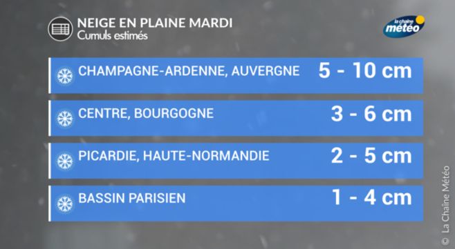 Localement la couche de neige au sol pourrait atteindre localement 5 à 10 cm en Champagne-Ardenne et en Auvergne, jusqu'à 4 cm sur les plateaux franciliens entourant Paris (Vexin, Brie).