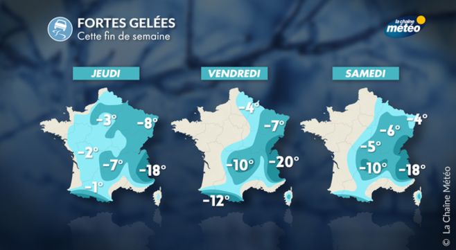 Si la tendance est dans l'ensemble à l'amélioration avec l'atténuation des chutes de neige, surtout sur la moitié nord, la prudence restera de mise car un regel est prévu dès la fin d'après-midi. Ce regel précédera des gelées marquées jusqu'à jeudi matin, avec en moyenne -1°C à -8°C sur 80% du territoire. Les régions du Massif central au Grand-Est seront les plus touchées.