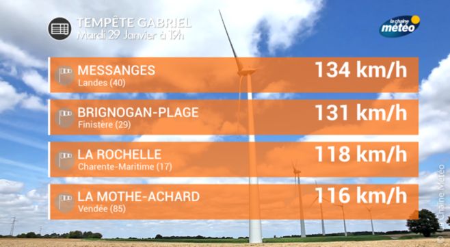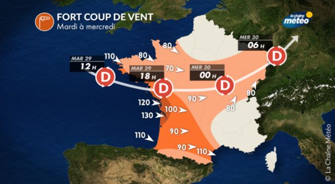 La dépression est désormais centrée sur le département du Maine-et-Loire et continue sa progression vers l’est. C’est à l’arrière de celle-ci, dans le fort courant dynamique de nord-ouest, que les vents sont les plus tempétueux près des côtes avec :