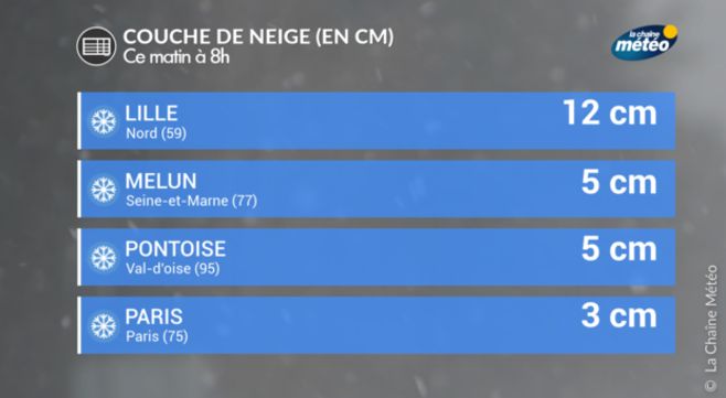 En soirée il est tombé en moyenne sur le nord-ouest, à l'exception de la Bretagne et du Centre-Ouest, 3 à 7 cm de neige en plaine et localement jusqu'à 10 cm. On observe 3 cm sur Paris.