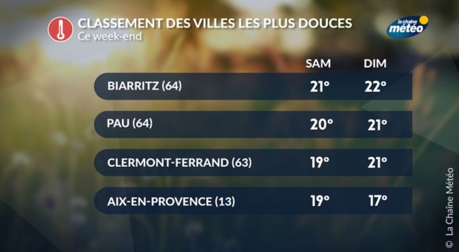 Biarritz, sous l'influence des Pyrénées et Clermont-Ferrand sous celle du Massif central seront concernées par cet effet de foehn.