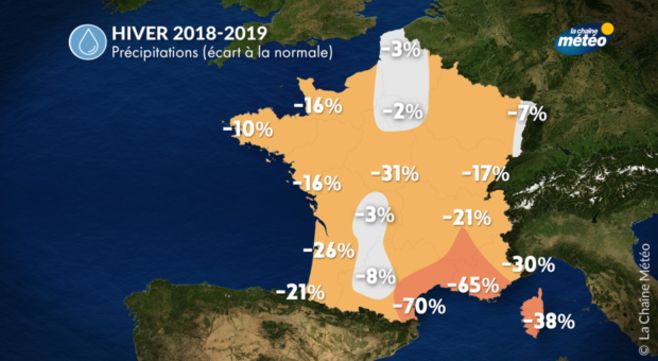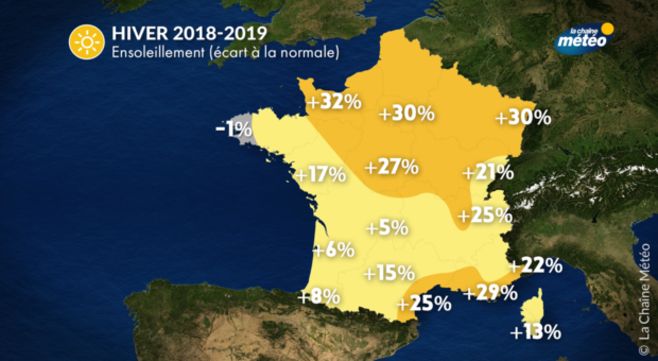 L'hiver 2018-2019 présente un excédent de température de 1,3°C par rapport à la normale calculée sur la période 1981-2010. Il s'agit de la 11ème saison consécutive où la température moyenne saisonnière dépasse la normale. L'écart à la normale atteint cet hiver 1,5°C près des frontières du nord alors que l'excédent de températures est de l'ordre de 0,5°C près des Pyrénées et de la Méditerranée. Concernant les précipitations, elles sont inférieures à la normale de 21% à l'échelle de la France avec un mois de décembre correctement arrosé mais un mois de février très sec. Enfin l'ensoleillement un peu déficitaire en décembre et janvier a été exceptionnel en février ; sur l'ensemble de l'hiver on observe un excédent de 18%.