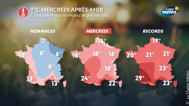 Le matin, il fera frais mais les gelées seront limitées aux régions de l'est et centrales. L'après-midi, la douceur restera de mise avec 14 à 20°C du nord au sud. Le pic de douceur est prévu mardi et mercredi avec des maximales entre 18 et 24°C du nord au sud et des pointes à 25°C en Aquitaine, des valeurs dignes d'un début d'été ! A partir de jeudi et surtout vendredi prochain et l'arrivée des nuages puis des pluies, les températures amorceront une baisse parfois sensible au nord, plus limitée au sud.