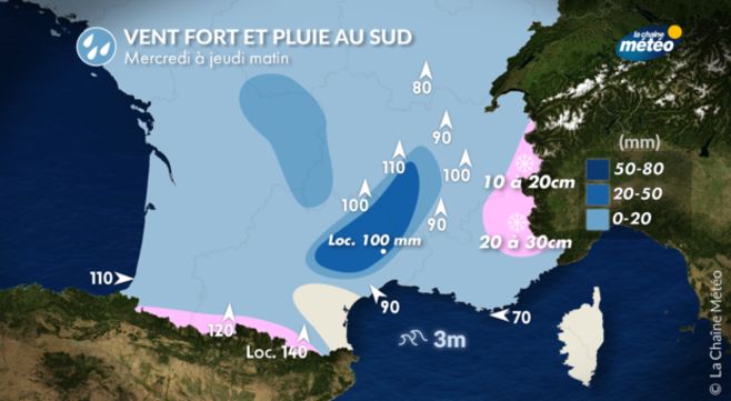 Le fort vent marin fera remonter une masse d'air très humide de Méditerranée qui se bloquera sur les Cévennes. Dans ce contexte, les premières pluies débuteront mercredi matin avant de se renforcer au fil des heures jusque la nuit suivante. Ces précipitations prendront localement un caractère instable et orageux avec des cumuls sur 24h de 50 à 90 mm, localement entre 90 et 110 mm soit environ 3 semaines de pluie.