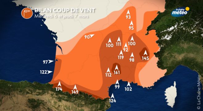 Les rafales ont été remarquables sur les crêtes Pyrénéennes avec une rafale maximale de 154 km/h au Pic du Midi (65) et de 174 km/h à Irat Orgambide (64). Des rafales de vent tempêteuses ont également été enregistrées dans le centre-est et en particulier sur le Massif central avec par exemple une rafale maximale de 123 km/h à Chalmazel (42) et 154 km/h aux Sauvages (69). Les vallées et plaines ont enregistré des valeurs moins élevées mais tout de même une rafale maximale de 100 km/h à Lyon Bron et à Clermont-Ferrand. Durant la soirée et la nuit suivante, ce sont les Alpes qui ont essuyé les plus fortes rafales de vent avec entre autre 145 km/h dans la station de Chamrousse et une rafale maximale de 244 km/h à l’Aiguille du midi (3845m).