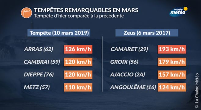 Le 7 mars 2017, une tempête de force comparable et même nettement supérieure en bord de maer avait concerné l'ouest de la France : il s'agissait de la tempête Zeus, battant aussi des records de vent, avec notamment 193 km/h à Camaret (29) et 185 km/h au Cap du Dramont, sur la Côte d'Azur. Mais les régions situées au nord de la Seine n'avaient pas été touchées, ce qui marque une différence avec la tempête de ce dimanche. Dans les deux cas, ces tempêtes surviennent en moyenne tous les dix ans, mais sur des zones différentes.