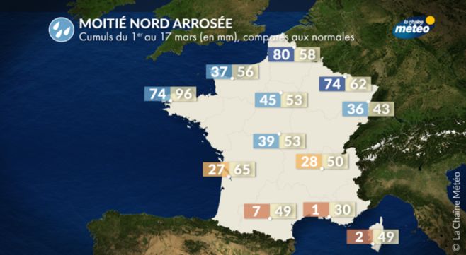 Sur les autres régions, les cumuls de pluie sont proches ou légèrement inférieurs à la normale. Seules les régions situées au nord de la Seine présentent un excédent pluviométrique de 10 à 30% en raison d'une première quinzaine de mars très arrosée. A Lille on a relevé 80 millimètres du 1er au 17 mars alors que la moyenne mensuelle n'est que de 58 mm.