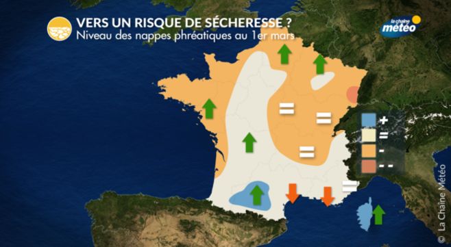Selon le BRGM "la tendance d'évolution du niveau des nappes indique que la recharge se poursuit sur 62 % des points, avec des niveaux en hausse. Le nombre de points stables (21 %) ou orientés à la baisse (17 %) demeure important. Cette situation n’est pas habituelle pour cette période de l’année. On devrait en effet déjà observer une incidence beaucoup plus marquée de la recharge hivernale, ce qui n’est pas le cas sur une grande partie du territoire".