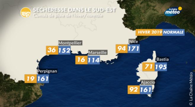 Ce début d'année 2019 met en évidence de gros contrastes pluviométriques entre les régions du nord correctement arrosées et le sud-est épargné par les perturbations et accusant un gros déficit pluviométrique. Les épisodes de vent forts à répétition sur le pourtour méditerranéen ont été un facteur aggravant la sécheresse de surface.