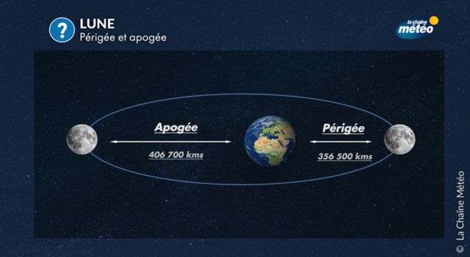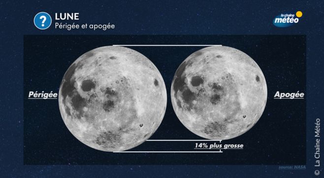 La distance de la Lune par rapport à la Terre varie entre 356 000 km et 406 000 km. Quand cette distance est inférieure à 360 000 km, on dit que la Lune est au périgée. Ce jeudi, la pleine Lune se trouvera très exactement à 359 400 km de nous. Elle apparaîtra 7% plus grosse ainsi que 30% plus lumineuse.