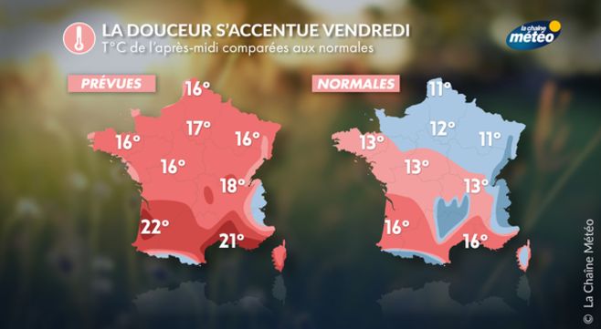 Ce pic de douceur est lié à la position géographique de l'anticyclone des Açores qui s'étale désormais sur la France. En haute altitude, la masse d'air remonte du Maroc et de la péninsule ibérique, où il fait actuellement entre 20°C et 22°C. Cette douceur, conjuguée à un ensoleillement radieux, culminera vendredi à l'échelle de notre pays, avec des températures comprises de 15°C à 22°C du nord au sud, en moyenne. Les vents sont faibles et orientés au secteur sud-est en fin de semaine.