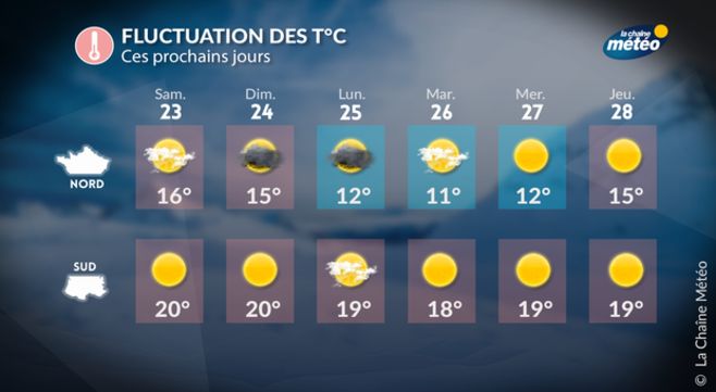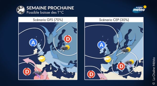 A partir de ce week-end, l'anticyclone aura tendance à poursuivre sa remontée vers les îles britanniques. Cette migration vers le nord entraînera lentement une bascule des vents au secteurs nord-est, d'abord sur les côtes de la Manche samedi, puis au nord de la Loire dimanche. De l'air plus frais, accompagné de nuages brumeux, envahira ces régions. En première partie de semaine prochaine, l'air frais, voire très frais au nord-est de la France, envahira l'ensemble du pays. Les températures redescendront au niveau des moyennes de saison, temporairement au-dessous, avec le retour des gelées matinales, parfois assez marquées sur l'est.