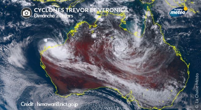 Le nord de l’Australie est frappé par deux cyclones : Trevor et Veronica. Des vents à plus de 200 km/h, des pluies torrentielles ainsi que des inondations sont en cours sur le Territoire du Nord et l'Australie Occidentale.