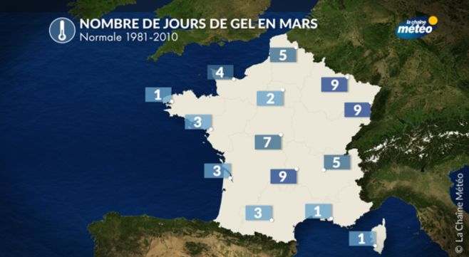 Au mois de mars les gelées sont encore fréquentes sur les régions du nord et de l'est de la France avec 5 à 9 jours en moyenne au cours du mois de mars. Dans l'ouest et le sud, on observe généralement entre 1 et 4 jours de gel dans l'intérieur des terres. Les gelées peuvent d'ailleurs se produire jusqu'à la fin du mois d'avril ou la première quinzaine de mai sur la plupart des nos régions. Les Saints de Glace (11,12,13 mai) sont d'ailleurs un repère pour les jardiniers car il s'agit souvent de la dernière période au cours de laquelle les dernières gelées sont observées.