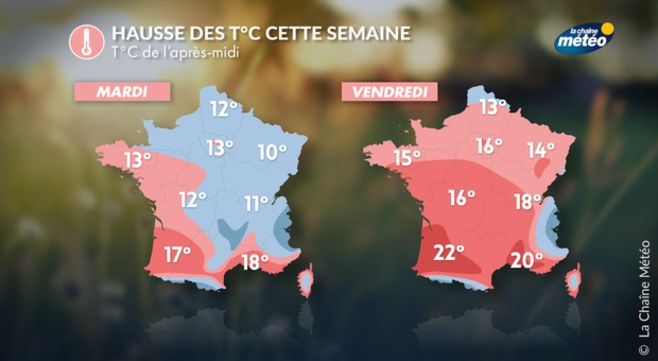 Jusqu'à demain, les températures sont souvent aux alentours des valeurs de saison, voire légèrement en dessous sur la moitié nord et dans l'est. En effet, le vent orienté au nord-est très sensible et les nuages accentuent la sensation de fraîcheur, voire de froid le matin. Il faut bien penser à se couvrir en allant dehors !