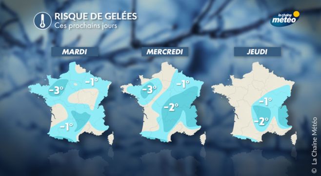 Dans un flux de secteur nord-est, les températures restent assez basses pour la saison. En effet, l'air reste frais surtout le matin avec quelques gelées. C'est particulièrement entre la Normandie et la Bourgogne-Franche-Comté qu'elles seront les plus fréquentes, entre lundi et mercredi matin. L'après-midi, les températures peinent à retrouver des valeurs de saison, et peuvent même localement rester en-dessous. On attendra par exemple 10 à 13°C au nord mardi après-midi.