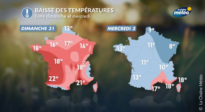 La baisse des températures de ces prochains jours va se faire en escalier. Il va y avoir des périodes en plateaux : lundi et mardi c'est la fraîcheur qui dominera, alors que mercredi et jeudi seront deux journées plutôt froides. En effet, le vent de secteur nord se maintiendra au cours de ces deux journées, avec un temps souvent nuageux et humide. Cela aura pour effet de faire baisser encore un cran le mercure, avec cette fois-ci des valeurs sous les normales saisonnières. Les températures de mercredi et jeudi auront du mal à dépasser 8 à 13°C du nord au sud.