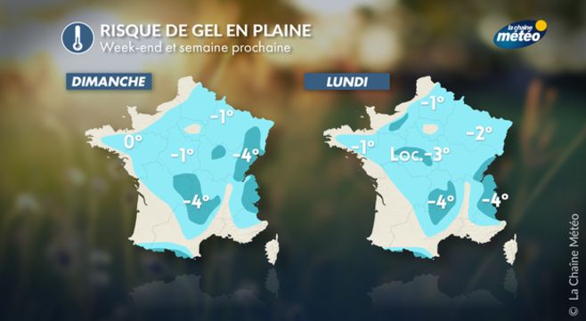 Avec l'arrivée d'air polaire ce week-end, les nuits de samedi à dimanche et de dimanche à lundi sont les plus délicates. Les régions du nord-est et du centre sont les plus exposées aux risques de gelées nocturnes en raison d'un ciel bien dégagé la nuit et d'un vent très faible. Les températures sont généralement comprises entre 0 et -2°C. Le bassin aquitain est également concerné par des gelées.