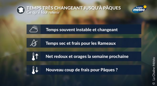Après ce week-end très frais, les températures vont vite grimper dès demain lundi en raison de l'orientation du vent au sud, faisant remonter de nouvelles averses orageuses. Les températures, jouant aux montagnes russes, dépasseront alors les niveaux de saison à partir de mardi jusqu'à Pâques.