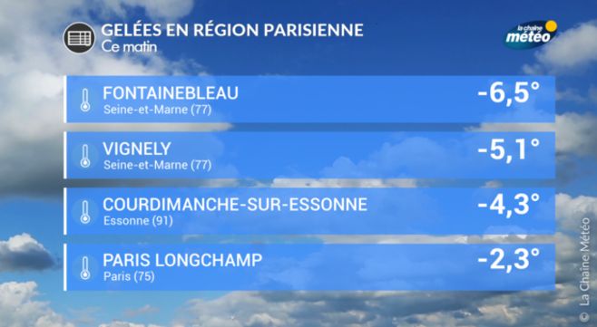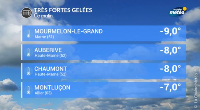 Les gelées nocturnes restent marquées jusqu'à lundi matin, avant un rapide redoux l'après-midi. Ainsi, à la faveur d'un ciel nocturne plutôt dégagé sur les régions du centre et du nord, les températures sont descendues entre -2°C et -7°C selon les régions. Très localement, des records de froid décadaires ont été enregistrés, notamment sur le Val de Loire et sur le Grand-Est avec -9°C à Mourmelon-le-Grand (51) ce dimanche matin.