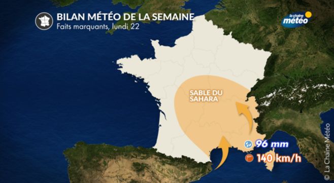 Entre lundi et mardi, un fort vent de sud venant du Sahara était porteur de sable. En effet, le sable soulevé dans le désert était ensuite porté par des vents d'altitude, lui permettant de traverser la mer Méditerranée. Ce sable c'est ensuite retrouvé dans le ciel français, avec des cieux souvent ocre et orangé lundi et mardi. Moins poétique, ce vent était souvent violent entre l'Île de beauté et le Var, avec des rafales aux alentours de 140 km/h, accompagné de pluies parfois fortes.