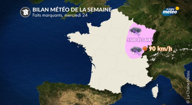 Mercredi, les orages ont gagnés les régions de l'est, avec une activité électrique importantes et des averses de grêle. Là aussi le vent à soufflé fort, jusqu'à 90 km/h en rafales.