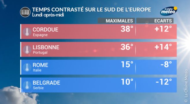 Le temps est très contrasté sur le sud de l'Europe jusqu'à mardi prochain avec un épisode de très fortes chaleurs sur la péninsule ibérique et des conditions presque hivernales de l'Italie aux Balkans.