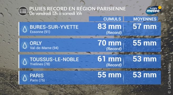 D'ores et déjà, il est tombé depuis hier (entre vendredi 8h et ce samedi 8h) 75,2mm d'eau à Bures-sur-Yvette (91), 63,2mm à Gometz-la-Ville (91), 61,8mm à Orly (94), 59,6mm à Combs-la-Ville (77), 54mmà Chevu(77), 53,2mm à Toussus-le-Noble (78) et 48mm à Paris (75) ce qui équivaut à 3 semaines, voire 1 mois de précipitations. A Orly (94), il n'avait jamais autant plu en 24 heures pour un mois de mai.
