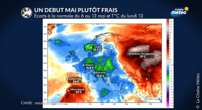 Des valeurs de températures particulièrement élevées ont ainsi été enregistrées le lundi 13 mai à titre d’exemple, 42°C à Marrakech, 34°C à Lisbonne et 35°C à Cordoba. Les anomalies de températures depuis début mai avoisinent 3 à 5°C en moyenne. Les écarts aux températures normales pour la saison sont encore plus marqués en Russie avec 10 à 12°C et des valeurs remarquables, non loin du cercle polaire arctique comme 31°C relevés à Kojnas le dimanche 12 mai.