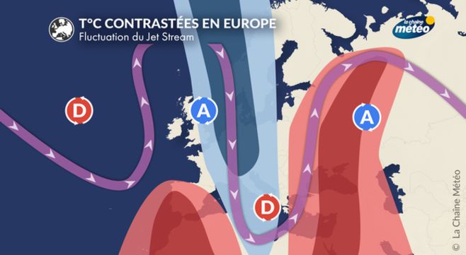 En météorologie, on parle de situation en Oméga du fait que la circulation atmosphérique d’altitude ressemble à la lettre grecque du même nom. En effet, en ce milieu de semaine, un anticyclone puissant est centré entre les îles britanniques et les pays Scandinaves. De part et d’autre, on retrouve des systèmes dépressionnaires qui font remonter de l’air chaud en altitude sur le Maroc et la péninsule ibérique, ainsi qu’à l’opposé sur la Russie, jusqu’en limite du cercle polaire arctique. L’anticyclone véhicule quant à lui de l’air plus frais sur l’ensemble de l’Europe centrale jusqu’à notre pays.