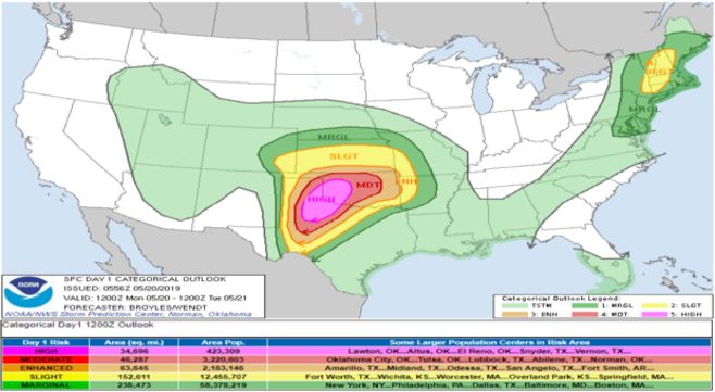 Le Storm Prediction Center a émis une alerte maximale pour le sud des plaines centrales. Un tornado outbreak, ou éruption de tornades, est très sérieusement envisagé pour le nord-ouest du Texas et sud-ouest de l'Oklahoma en milieu et fin d'après-midi.