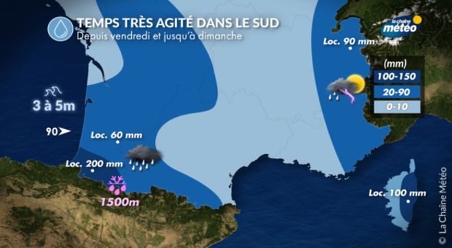 Après les conditions majoritairement anticycloniques qui ont persisté sur l'hexagone depuis dimanche dernier, le temps change radicalement. La formation de dépressions sur l'Espagne puis sur la France engendre un temps instable, parfois orageux, avec de fortes pluies sur le sud. Soyez donc vigilants lors de vos déplacements, en plaine comme en montagne, car cette dégradation est propice aux développements d'importants cumuls de pluies près des Pyrénées avec de fortes chutes de neige à partir de 1500 m.