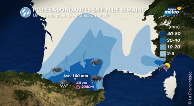 On attend des cumuls pluviométriques compris entre 40 à 60 mm sur le piémont pyrénéen, et de 50 à 80 mm sur le versant nord des reliefs. Localement, des cumuls entre 100 à 110 mm pourraient être relevés en montagne., soit l'équivalent d' un mois de précipitations en 36 heures. Avec le passage de la "goutte froide" en altitude (air froid associé à la dépression), la neige tombera une nouvelle fois sur toute la chaîne au-dessus de 2000 m (avec de 40 à 60 cm de poudreuse), particulièrement aux confins de l'Ariège, de l'Andorre et de l'est des Pyrénées Orientales.