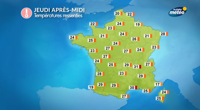 Les températures prévues sont les températures sous abris. C'est-à-dire que ces valeurs seront atteintes à l'ombre et en l'absence de vent. Pour se rapprocher de votre ressenti, il faut donc incorporer ces paramètres dans la méthode de calcul des températures pour obtenir les fameuses températures ressenties. Pour ce jeudi, l'ensoleillement sera généreux et le vent faible, avec donc un ressenti souvent plus chaud. La sensation sera clairement estivale, surtout au sud avec un ressenti pouvant se rapprocher des 30°.