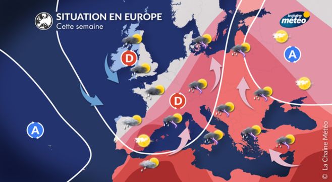 L'anticyclone continue à se décaler en direction de l’Europe centrale et de la Russie, alors qu’une situation fortement dépressionnaire se met en place sur les Îles Britanniques jusqu'en Espagne. Dans le prolongement de ces dépressions, un talweg (le prolongement d'une dépression) nous concerne et le flux bascule du sud-est au sud-ouest. Un contraste thermique très important se met en place en altitude entre l’est et l'ouest du pays. Cette situation est propice au développement d'orages potentiellement violents, en particulier sur un axe sud-ouest/nord-est entre mardi soir et la fin de nuit de mercredi à jeudi.
