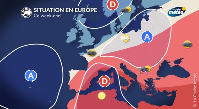 Tout au long du week-end, les températures seront de saison ou légèrement inférieures des régions atlantiques aux côtes de la Manche. C'est à nouveau à l'est du Rhône et de la Saône qu'on attend les températures les plus élevées avec 25 à 30°C lundi après-midi.
