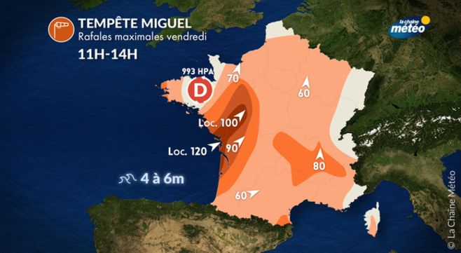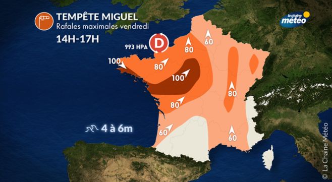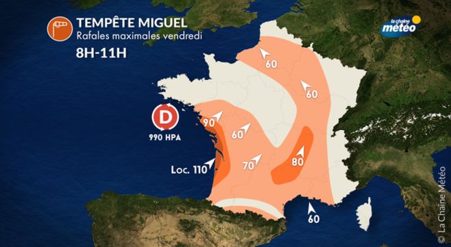 Cette dépression, qui a pris naissance dans les parages des Açores, au large du Portugal, a été baptisée Miguel par les services météorologiques espagnols. Jeudi, elle s'est creusée au large des côtes nord-ouest de l'Espagne et a atteint le stade de tempête, avec une pression proche de 989 hPa, ce qui est particulièrement bas. Elle remontait la nuit dernière vers le nord du golfe de Gascogne en conservant ses caractéristiques de tempête extratropicale, c'est à dire à coeur chaud. Aujourd'hui, cette forte dépression traverse la Bretagne avant de s'éloigner vers la mer du Nord en soirée. Elle génère un fort coup de vent avec des rafales de 80 km/h à 100km/h entre les côtes aquitaines et celles normandes, en passant par la Bretagne. Les rafales les plus violentes concernent les littoraux exposés du centre-ouest (Vendée, Charente-Maritime et Gironde). avec un risque d'atteindre 120 km/h sur les îles et caps exposés.