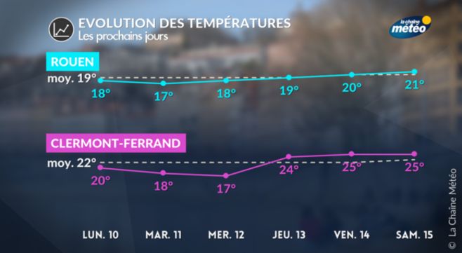 Les températures évolueront peu tout au long de la semaine avec une moyenne de 8 à 18°C le matin du nord au sud. L'après-midi, on attend de 18 à 25°C des régions atlantiques à l'Alsace au Centre-Est jeudi, jusqu'à 30°C dans l'extrême sud-est. Les températures gagneront 2°C en fin de semaine et l'ambiance pourra même lourde les après-midis dans l'est.