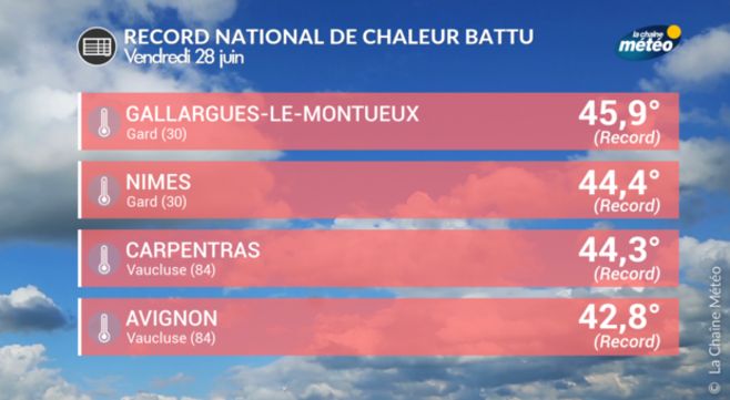A 17h50 : le record national de température s'établit au final à 45,9°C à Gallargues-le-Montrieux dans le Gard. Deux autres localités du Gard ont dépassé la barre des 45°C : Marsillargues avec 45,1°C et Villevieille avec 45,4°C. Les grandes villes du Languedoc-Roussillon à la Provence ont pour la plupart battu des records absolus de chaleur : Nîmes avec 44,4°C, Carpentras 44,3°C, Avignon 42,7°C, Montpellier 42,0°C, Perpignan 41,9°C. La ville du Mans a battu un record de chaleur avec 37,7°C (ancien record 37,5°C le 21 juin 2017).