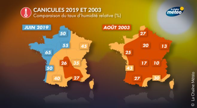 En ce mois de juin 2019, on a à la fois une advection d'air très sec en provenance d'Afrique du Nord mais elle se combine avec un flux de sud-sud-ouest plus humide en provenance de l'Atlantique car l'anticyclone est moins puissant qu'en 2003 et la France se situe en bordure ouest de l'anticyclone. Résultat, les taux d'humidité sont plus importants avec 30 à 50% d'humidité relative sur la partie Est du pays et 50 à 75% d'humidité relative entre les côtes atlantiques, le bassin parisien et les Hauts-de-France.