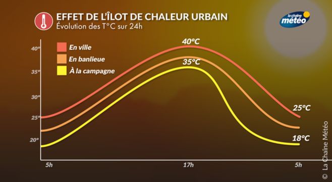 Par effet d’îlot de chaleur urbain, les centres villes peuvent être bien plus chauds que les campagnes environnantes. Cette différence devient encore plus importante en période caniculaire et ceci est dû à plusieurs facteurs.