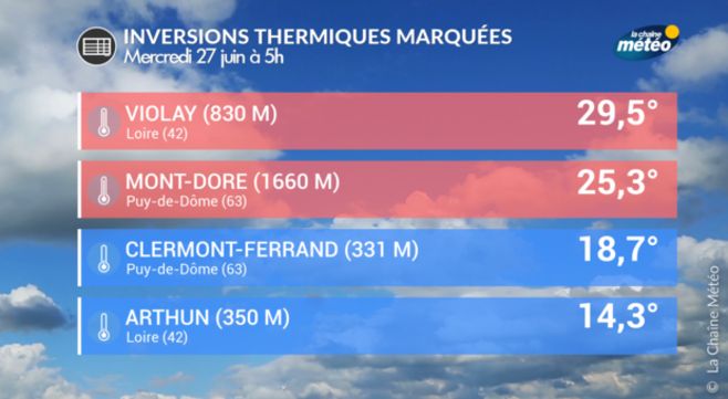 Ce mercredi matin, les températures étaient particulièrement élevées sur le relief du Massif central, en particulier sur les monts du lyonnais ou encore les monts d’Auvergne avec souvent près de 30°C à 800 mètres d’altitude et environ 25°C à 1500 mètres. Dans le même temps, les températures étaient inférieures à 20°C en plaine, hors centre-urbain, avec pas plus d’une quinzaine de degrés en plaine du Forez et 19°C en Limagne.