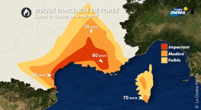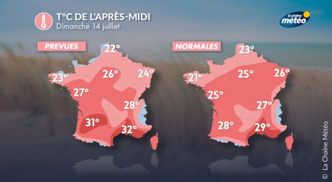 Les températures évoluent le matin de 12 à 20°C des côtes de la Manche aux bords de la Méditerranée. L'après-midi, vous avez entre 18 et 22°C sur les régions voisines de la Manche et 22 à 28°C sur le reste de la moitié nord, ce qui est de saison et agréable. Au sud, il fait chaud avec 25 à 34°C des valeurs tout à fait de saison. A noter un risque accrû d'incendies de végétation en basse vallée du Rhône en raison de la combinaison du Mistral assez soutenu, de la chaleur et de sols toujours très secs malgré les quelques orages du début de semaine.