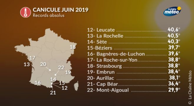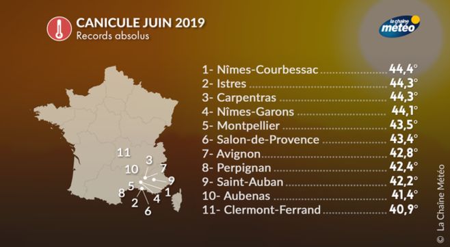 A l'exception de la Bretagne, la France a connu une période caniculaire en cette fin juin 2019. De nombreux records de chaleur ont été battus, avec des températures souvent supérieures à 40°C sur la moitié sud et 35°C sur la moitié nord. Les nuits n’offraient guère de répit, avec des températures qui ne descendaient pas en-dessous des 20°C dans le nord et 25°C dans le sud.