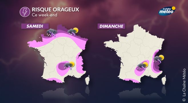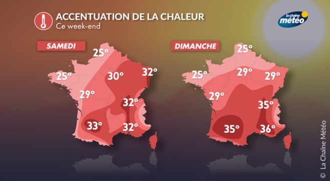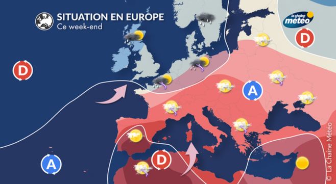 Pour votre week-end, vous avez une chaleur de plus en plus forte et lourde dimanche, qui annonce une vague de chaleur la semaine prochaine. Pour les vacanciers, vous avez des orages samedi, puis plus de soleil dimanche.