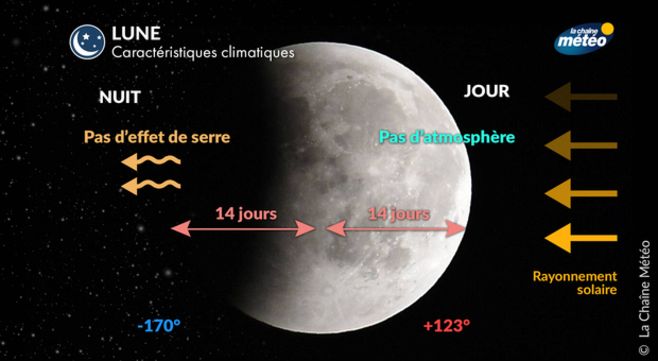 On peut considérer qu’il n’y a pas d'atmosphère sur la Lune, hormis quelques traces de gaz liées à l’ancienne activité volcanique (hydrogène, argon, hélium, sodium). Cette absence d’atmosphère ne permet pas la formation de phénomènes climatiques, à la différence de la Terre et même de la planète Mars. Il n’y a pas de déplacement d’air, pas de vent et aucune formation nuageuse. Le sol lunaire est donc rocailleux, totalement désertique et sec, hormis ces traces d’eau dans le sous-sol. Le ciel est d’une pureté absolue et noir, de jour comme de nuit : en effet, il faut des gaz atmosphériques (en particuliers la vapeur d’eau) pour colorer le ciel comme sur la Terre. Le passage du jour lunaire (qui dure 14 jours terrestres) à la nuit lunaire (de durée équivalente) se fait brusquement. L’absence de gaz à effet de serre ne protège pas la Lune des radiations solaires ni des fortes amplitudes de températures, qui atteignent +120°C le jour, tandis que pendant la nuit, celle-ci descend à -170°C, avec des pointes à -230°C dans le fond des cratères du pôle sud. On constate donc que la Lune est totalement hostile pour l’Homme.